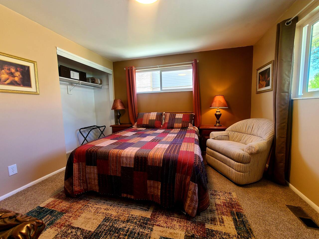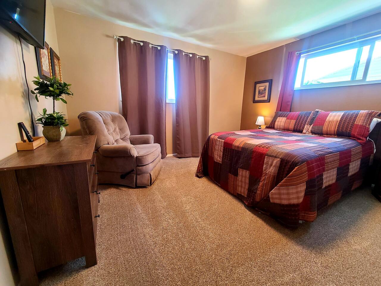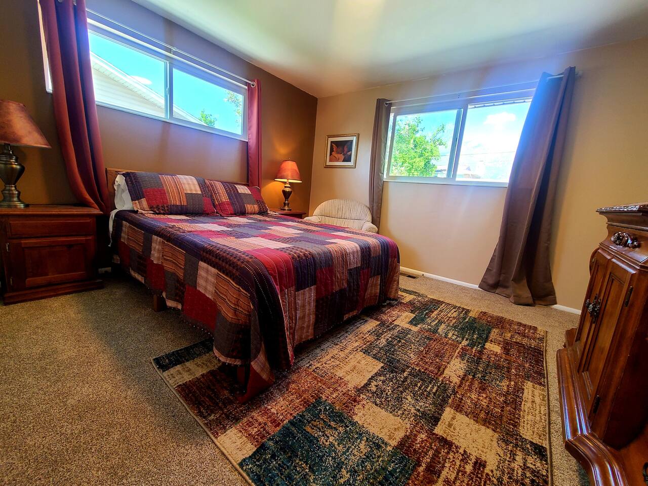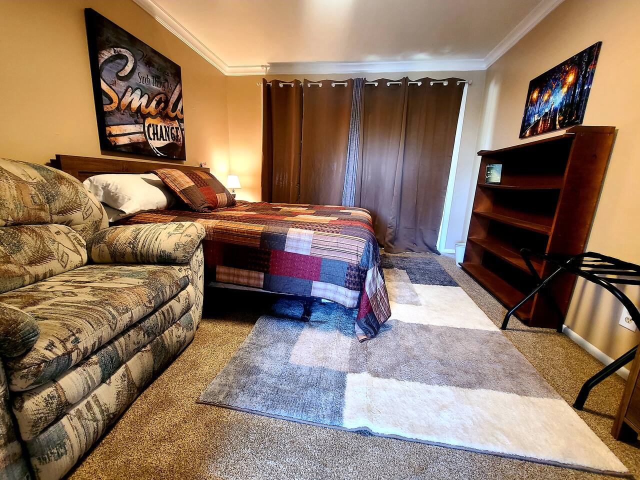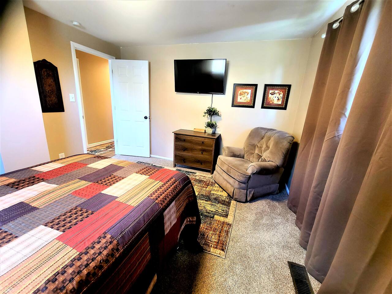 Located just 5 minutes from the Cottonwood Canyons and Utah’s world-class ski resorts, this rustic 4BR main-level apartment is the perfect all-season escape. Whether you’re hitting the slopes, exploring nearby hiking and biking trails, or simply soaking in the stunning views of Mount Olympus and the surrounding canyons, this cozy retreat has it all. Enjoy mountain décor, a fully equipped kitchen, and a spacious living area to unwind after a day of adventure. Plus, you’re just a short 8-minute drive to the vibrant Fort Union Business District, with a wide range of shops and dining options. Living Area: Relax in style in the beautifully furnished living room, featuring a sleeper sofa, overstuffed couches, and three flat-screen smart TVs for cozy nights in. Kitchen & Dining: Cook up a feast in the fully equipped kitchen, complete with modern appliances, and enjoy meals in the adjacent dining area. Bedrooms & Bathrooms: The home comfortably sleeps up to 10 guests across 4 spacious bedrooms, plus a queen sleeper sofa in the living room. Each bedroom includes a queen bed, TV, and armchair for added comfort. The master suite boasts a private en-suite bathroom, while the shared bathroom features a large vanity and double sinks. Outdoor Area & Amenities: Enjoy partial mountain views from the shared patio, which includes a gas firepit, grill, picnic table, and a small grassy area perfect for play.