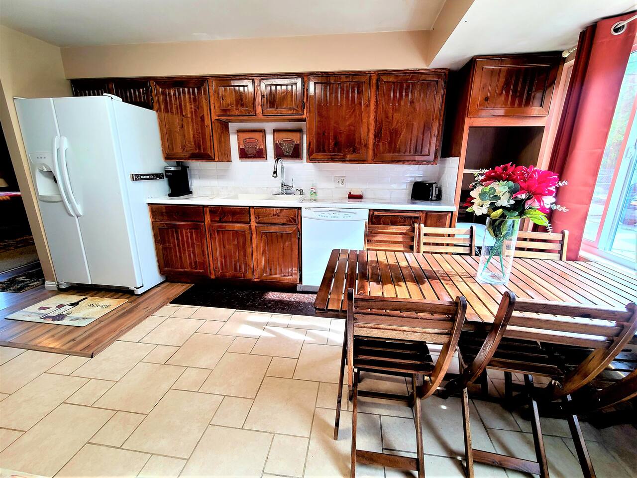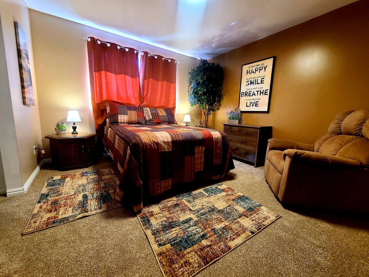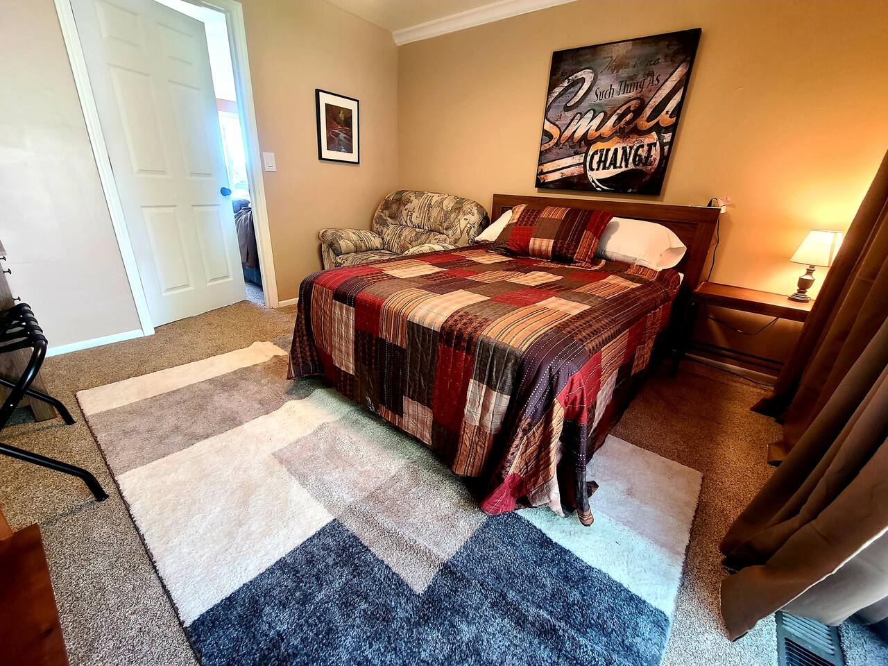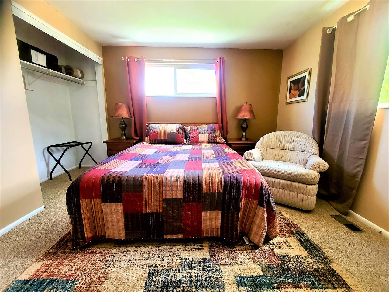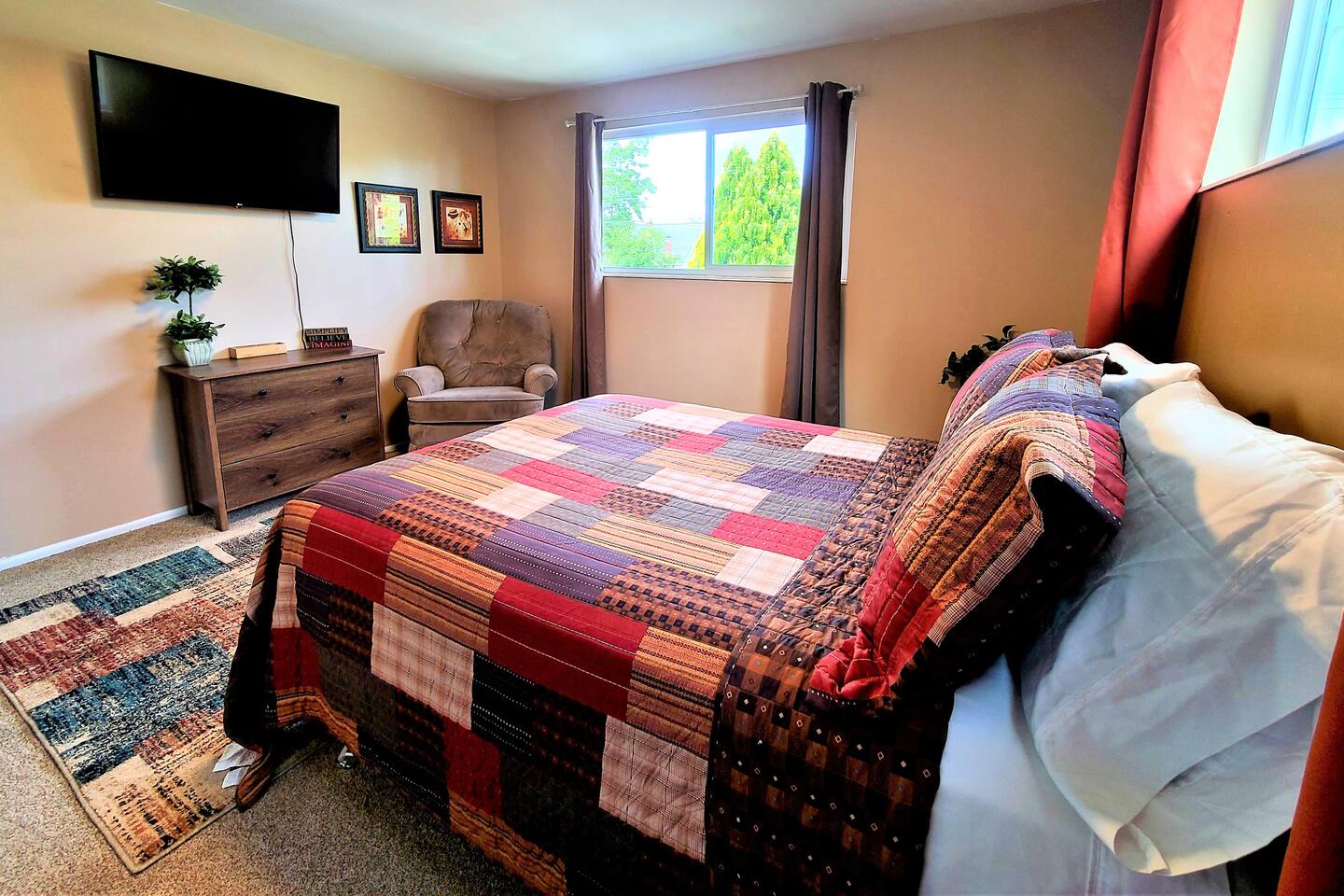 Located just 5 minutes from the Cottonwood Canyons and Utah’s world-class ski resorts, this rustic 4BR main-level apartment is the perfect all-season escape. Whether you’re hitting the slopes, exploring nearby hiking and biking trails, or simply soaking in the stunning views of Mount Olympus and the surrounding canyons, this cozy retreat has it all. Enjoy mountain décor, a fully equipped kitchen, and a spacious living area to unwind after a day of adventure. Plus, you’re just a short 8-minute drive to the vibrant Fort Union Business District, with a wide range of shops and dining options. Living Area: Relax in style in the beautifully furnished living room, featuring a sleeper sofa, overstuffed couches, and three flat-screen smart TVs for cozy nights in. Kitchen & Dining: Cook up a feast in the fully equipped kitchen, complete with modern appliances, and enjoy meals in the adjacent dining area. Bedrooms & Bathrooms: The home comfortably sleeps up to 10 guests across 4 spacious bedrooms, plus a queen sleeper sofa in the living room. Each bedroom includes a queen bed, TV, and armchair for added comfort. The master suite boasts a private en-suite bathroom, while the shared bathroom features a large vanity and double sinks. Outdoor Area & Amenities: Enjoy partial mountain views from the shared patio, which includes a gas firepit, grill, picnic table, and a small grassy area perfect for play.