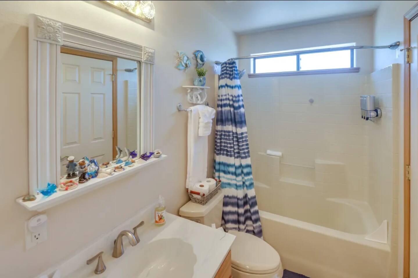 SLEEPING ARRANGEMENTS: - Bedroom 1: King Bed, Full Futon - Bedroom 2: Queen Bed - Bedroom 3: 2 Twin Beds - Additional Sleeping: Pack 'n Play INDOOR LIVING: - Smart TVs - Dining table - Modern decor, vaulted ceilings, open floor plan - Jetted tub OUTDOOR LIVING: - Covered patio - Dining area - Mountain views - Fire pit - Private yard KITCHEN: - All major appliances including dishwasher - Keurig/drip coffee maker - Bar seating - High chair - Toaster GENERAL: - Free WiFi - Central A/C & electric heating - Complimentary toiletries - Linens & towels - Hair dryer, iron board FAQ: - Coyotes present in the area - 3 exterior security cameras (facing out) - Pet fee (paid pre-trip; dogs only, 2 max) ACCESSIBILITY: - Step-free access PARKING: - Garage (2 vehicles) - Driveway (2 vehicles) - RV/trailer parking available (2 full RV hookups available)