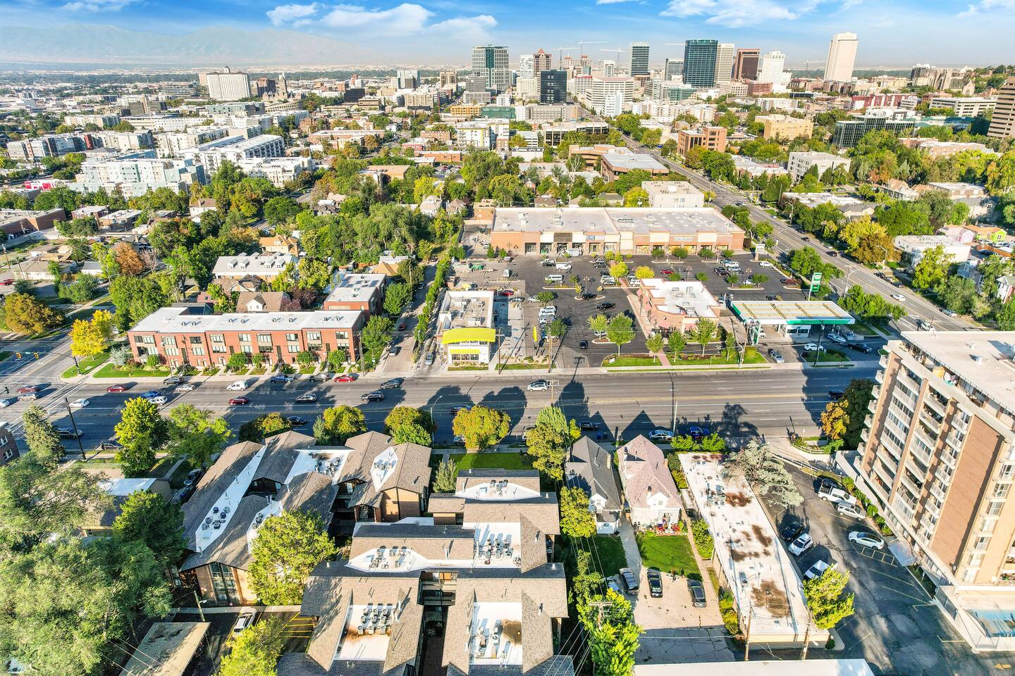 Across the street is a everything you need from groceries to gas stations. South 1.5 blocks is a main road (400 S) with a TRAX station, Starbucks and a world of food places.